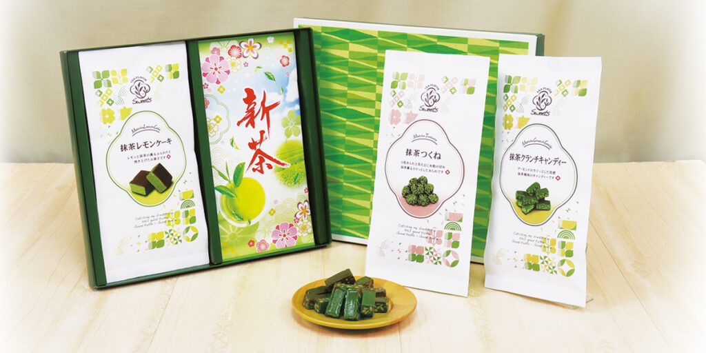専属のパティシエが作る卸売りの焼菓子や卸売りスイーツ、毎年新茶カタログに掲載している新茶予約スイーツの展示を行っています。試食もできるように準備していますので、ぜひご自分の舌で確かめてみてください。